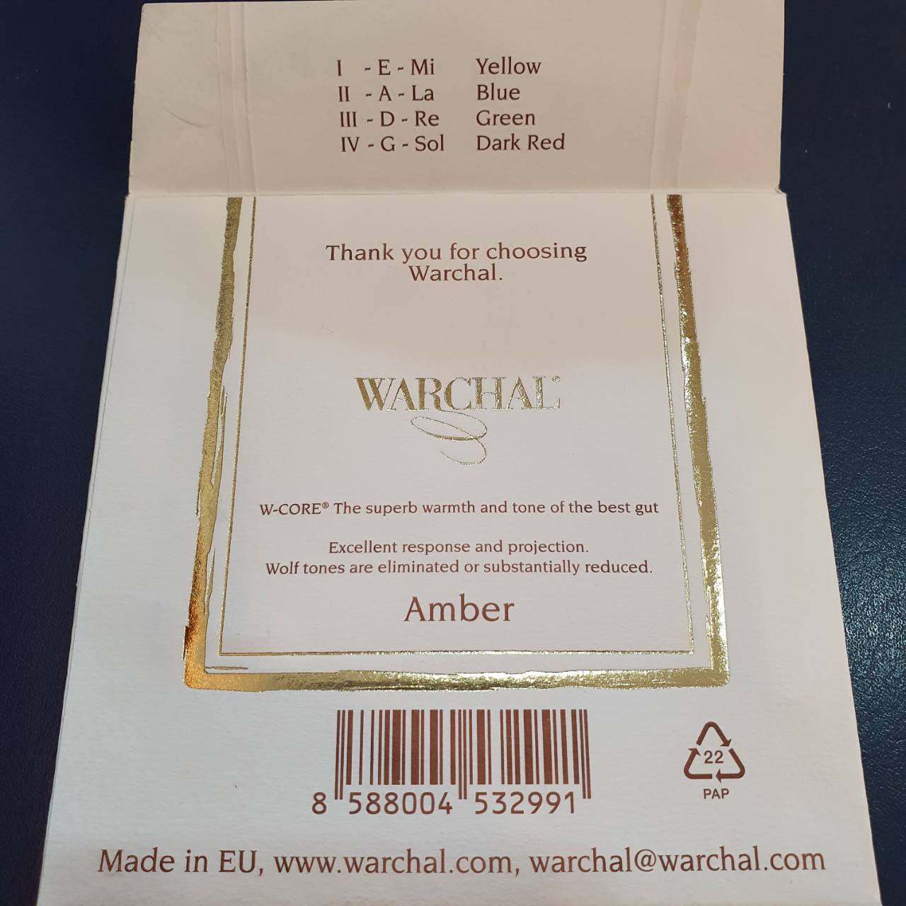 Amber系列名稱取自「琥珀」,象徵自然的光澤與時間淬鍊出的溫潤質感。它的研發靈感來自於希望找到「鋼E弦的穩定性」與「羊腸弦的音色柔軟度」之間的黃金比例,經過多次實驗後,Warchal成功開發出一種獨特的「螺旋結構設計」,讓E弦在張力與共鳴之間達到完美平衡。
